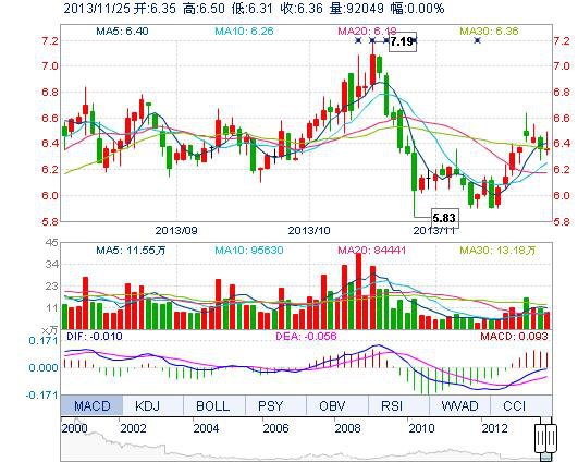 今開: 6.35 成交量: 9.20萬(wan) 手 振幅: 2.99% 最高: 6.50 成交額: 5905.35萬(wan) 元 換手率: 1.03% 最低: 6.31 總市值: 56.68億(yi) 市淨率: 2.10 昨收: 6.36 流通市值: ...