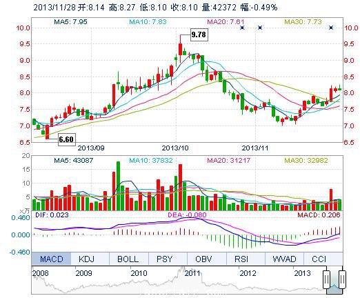 | 今 開: | 8.14 | 成交量: | 4.24萬手 | 振 幅: | 2.09% |