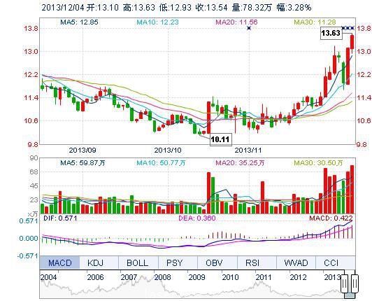 今開: 13.10 成交量: 78.32萬(wan) 手 振幅: 5.34% 最高: 13.63 成交額: 10.40億(yi) 元 換手率: 8.28% 最低: 12.93 總市值: 141.41億(yi) 市淨率: 4.05 昨收: 13.11 流通市...
