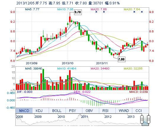 | 今 開: | 7.75 | 成交量: | 3.07萬手 | 振 幅: | 3.10% |
