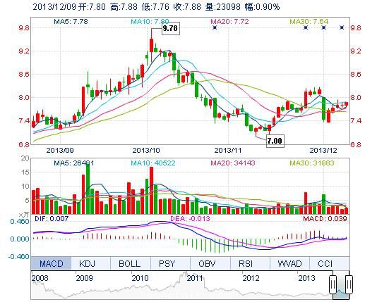 | 今 開: | 7.80 | 成交量: | 2.31萬手 | 振 幅: | 1.54% |