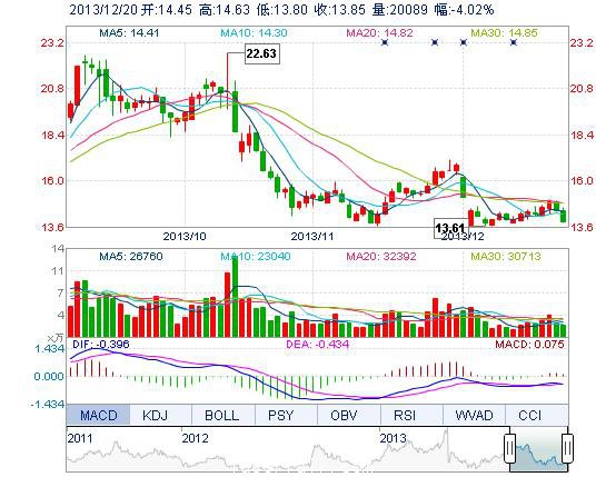 今開: 14.45 成交量: 2.01萬(wan) 手 振幅: 5.75% 最高: 14.63 成交額: 2825.34萬(wan) 元 換手率: 2.93% 最低: 13.80 總市值: 18.56億(yi) 市淨率: 5.71 昨收: 14.43 流通市...