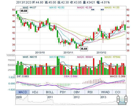 今開: 44.80 成交量: 4.34萬(wan) 手 振幅: 6.02% 最高: 45.00 成交額: 1.87億(yi) 元 換手率: 1.51% 最低: 42.30 總市值: 128.14億(yi) 市淨率: 8.44 昨收: 44.85 流通市值...
