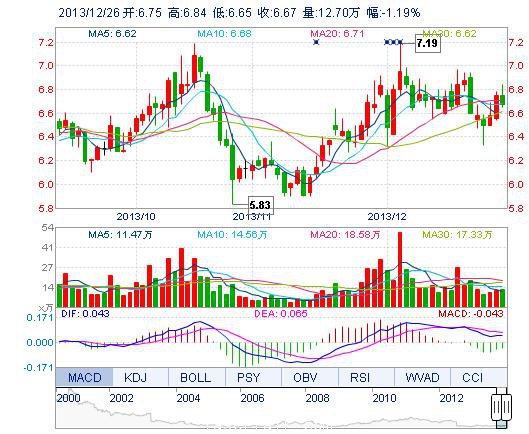 | 今 開: | 6.75 | 成交量: | 12.70萬手 | 振 幅: | 2.81% |