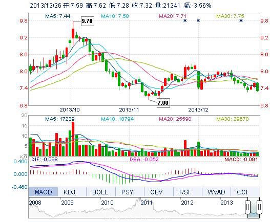 今開: 7.59 成交量: 2.12萬(wan) 手 振幅: 4.48% 最高: 7.62 成交額: 1579.17萬(wan) 元 換手率: 0.77% 最低: 7.28 總市值: 20.86億(yi) 市淨率: 3.35 昨收: 7.59 流通市值: ...