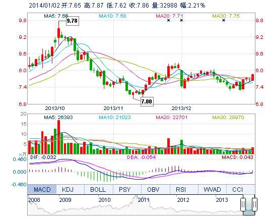 今開: 7.65 成交量: 3.30萬(wan) 手 振幅: 3.25% 最高: 7.87 成交額: 2565.97萬(wan) 元 換手率: 1.20% 最低: 7.62 總市值: 22.40億(yi) 市淨率: 3.59 昨收: 7.69 流通市值: ...