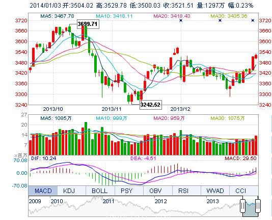 今開: 3504.02 最高: 3529.78 昨收: 3513.52 最低: 3500.03 成交量: 1297.47萬(wan) 手 振幅: 0.85% 成交額: 195.62億(yi) 元