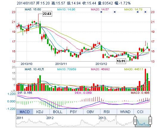| 今 開: | 15.20 | 成交量: | 8.35萬手 | 振 幅: | 4.01% |