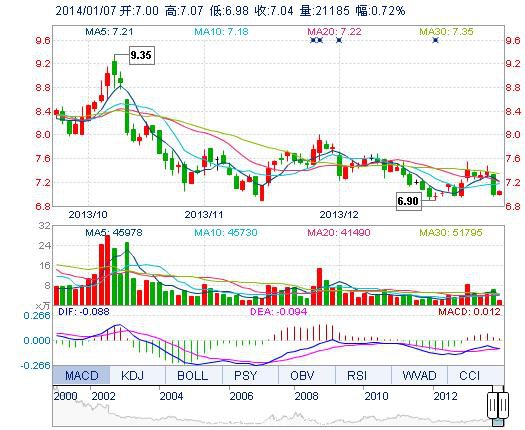 今開: 7.00 成交量: 2.12萬(wan) 手 振幅: 1.29% 最高: 7.07 成交額: 1489.15萬(wan) 元 換手率: 0.49% 最低: 6.98 總市值: 30.75億(yi) 市淨率: 2.25 昨收: 6.99 流通市值: ...