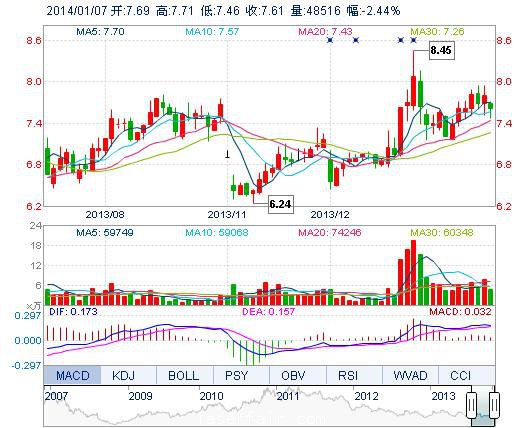 | 今 開: | 7.69 | 成交量: | 4.85萬手 | 振 幅: | 3.21% |