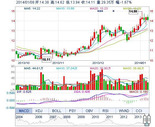 | 今 開: | 14.38 | 成交量: | 29.35萬手 | 振 幅: | 4.74% |