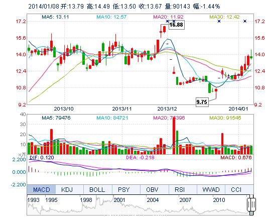 今開: 13.79 成交量: 9.01萬(wan) 手 振幅: 7.14% 最高: 14.49 成交額: 1.25億(yi) 元 換手率: 5.19% 最低: 13.50 總市值: 23.74億(yi) 市淨率: 6.78 昨收: 13.87 流通市值:...