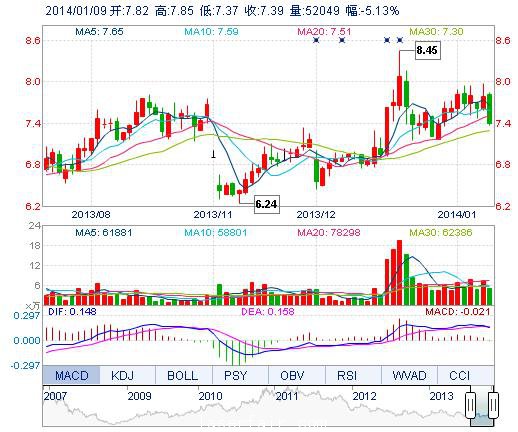 今開: 7.82 成交量: 5.20萬(wan) 手 振幅: 6.16% 最高: 7.85 成交額: 3978.83萬(wan) 元 換手率: 2.61% 最低: 7.37 總市值: 14.72億(yi) 市淨率: 3.00 昨收: 7.79 流通市值: ...