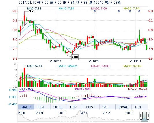 今開: 7.65 成交量: 4.22萬(wan) 手 振幅: 4.15% 最高: 7.66 成交額: 3153.92萬(wan) 元 換手率: 1.54% 最低: 7.34 總市值: 21.03億(yi) 市淨率: 3.37 昨收: 7.71 流通市值: ...