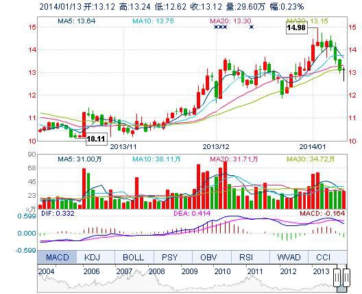| 今 開: | 13.12 | 成交量: | 29.60萬手 | 振 幅: | 4.74% |