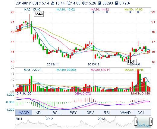 | 今 開: | 15.14 | 成交量: | 3.63萬手 | 振 幅: | 4.23% |