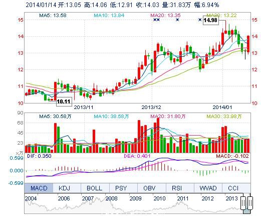 | 最 高: | 14.06 | 成交額: | 4.30億元 | 換手率: | 3.37% |