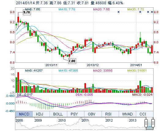 今開: 7.36 成交量: 4.66萬(wan) 手 振幅: 7.49% 最高: 7.86 成交額: 3545.29萬(wan) 元 換手率: 1.70% 最低: 7.31 總市值: 22.26億(yi) 市淨率: 3.57 昨收: 7.34 流通市值: ...