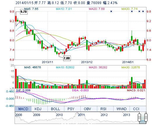 今開: 7.77 成交量: 7.61萬(wan) 手 振幅: 5.38% 最高: 8.12 成交額: 6066.77萬(wan) 元 換手率: 2.77% 最低: 7.70 總市值: 22.80億(yi) 市淨率: 3.66 昨收: 7.81 流通市值: ...