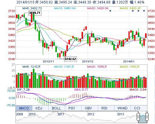 今開: 3450.92 最高: 3495.24 昨收: 3444.24 最低: 3448.30 成交量: 1201.51萬(wan) 手 振幅: 1.36% 成交額: 170.26億(yi) 元