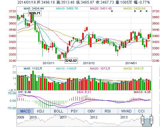 今開: 3496.19 最高: 3513.46 昨收: 3494.68 最低: 3465.87 成交量: 1064.96萬(wan) 手 振幅: 1.36% 成交額: 152.75億(yi) 元