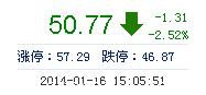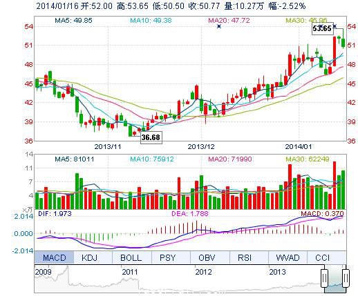 今開: 52.00 成交量: 10.27萬(wan) 手 振幅: 6.05% 最高: 53.65 成交額: 5.32億(yi) 元 換手率: 3.57% 最低: 50.50 總市值: 151.12億(yi) 市淨率: 9.95 昨收: 52.08 流通市值...