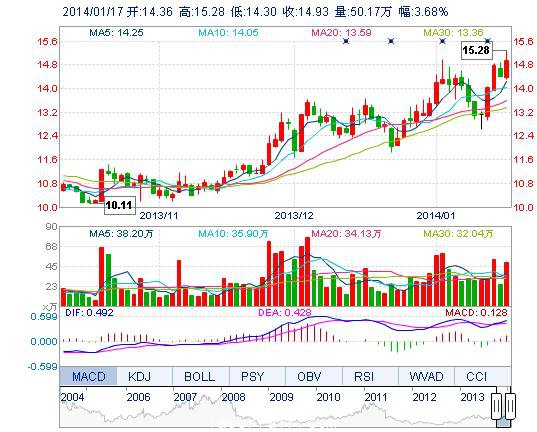 今開: 14.36 成交量: 50.17萬(wan) 手 振幅: 6.81% 最高: 15.28 成交額: 7.52億(yi) 元 換手率: 5.31% 最低: 14.30 總市值: 155.93億(yi) 市淨率: 4.46 昨收: 14.40 流通市值...