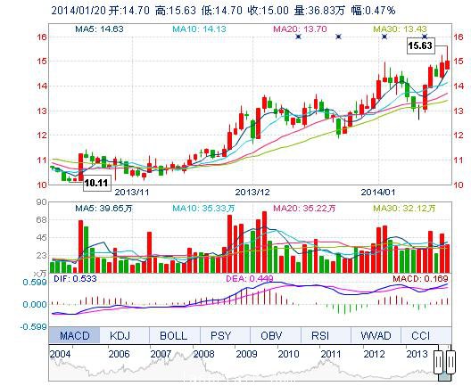 今開: 14.70 成交量: 36.83萬(wan) 手 振幅: 6.23% 最高: 15.63 成交額: 5.61億(yi) 元 換手率: 3.89% 最低: 14.70 總市值: 156.66億(yi) 市淨率: 4.48 昨收: 14.93 流通市值...