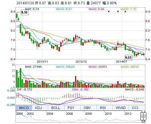 今開: 6.67 成交量: 2.41萬(wan) 手 振幅: 3.30% 最高: 6.83 成交額: 1619.45萬(wan) 元 換手率: 0.55% 最低: 6.61 總市值: 29.40億(yi) 市淨率: 2.15 昨收: 6.67 流通市值: ...