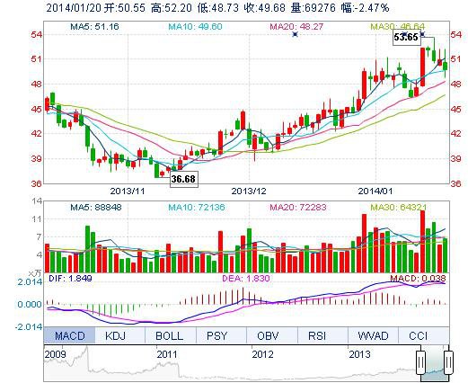 今開: 50.55 成交量: 6.93萬(wan) 手 振幅: 6.81% 最高: 52.20 成交額: 3.48億(yi) 元 換手率: 2.41% 最低: 48.73 總市值: 147.88億(yi) 市淨率: 9.74 昨收: 50.94 流通市值...