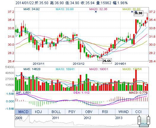 今開: 35.50 成交量: 1.60萬(wan) 手 振幅: 5.67% 最高: 36.90 成交額: 5747.82萬(wan) 元 換手率: 0.46% 最低: 34.90 總市值: 155.72億(yi) 市淨率: 9.59 昨收: 35.25 流通市...