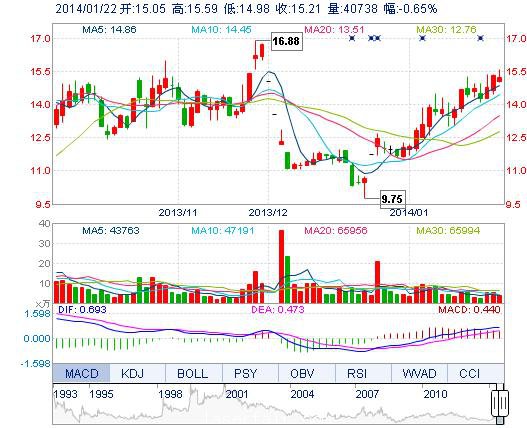 | 今 開: | 15.05 | 成交量: | 4.07萬手 | 振 幅: | 3.98% |
