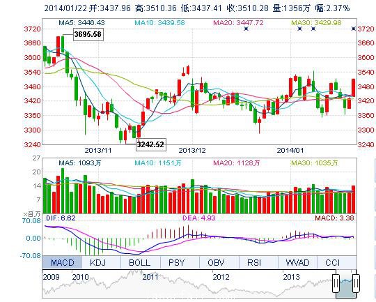 今開: 3437.96 最高: 3510.36 昨收: 3428.86 最低: 3437.41 成交量: 1356.38萬(wan) 手 振幅: 2.13% 成交額: 198.18億(yi) 元
