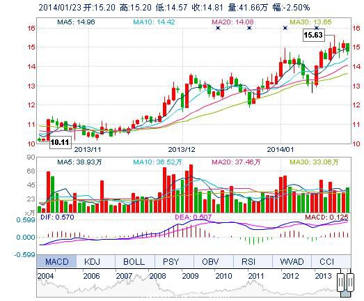 今開: 15.20 成交量: 41.66萬(wan) 手 振幅: 4.15% 最高: 15.20 成交額: 6.16億(yi) 元 換手率: 4.41% 最低: 14.57 總市值: 154.68億(yi) 市淨率: 4.43 昨收: 15.19 流通市值...