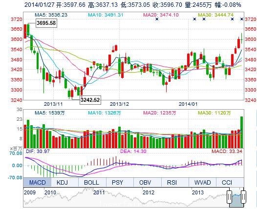 今開: 3597.66 最高: 3637.13 昨收: 3599.65 最低: 3573.05 成交量: 2455.08萬(wan) 手 振幅: 1.78% 成交額: 246.41億(yi) 元