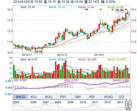 今開: 15.60 成交量: 22.14萬(wan) 手 振幅: 4.90% 最高: 16.15 成交額: 3.50億(yi) 元 換手率: 2.32% 最低: 15.38 總市值: 164.78億(yi) 市淨率: 4.68 昨收: 15.70 流通市值...