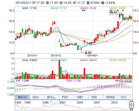 | 最 高: | 17.95 | 成交額: | 1.18億元 | 換手率: | 3.91% |