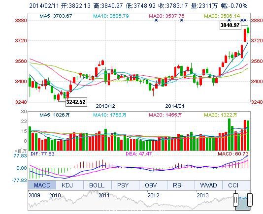 今開: 3822.13 最高: 3840.97 昨收: 3809.84 最低: 3748.92 成交量: 2311.24萬(wan) 手 振幅: 2.42% 成交額: 329.16億(yi) 元