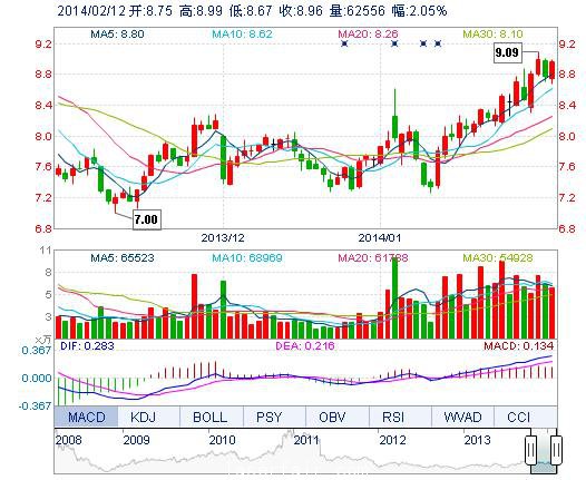 今開: 8.75 成交量: 6.26萬(wan) 手 振幅: 3.64% 最高: 8.99 成交額: 5543.56萬(wan) 元 換手率: 2.28% 最低: 8.67 總市值: 25.54億(yi) 市淨率: 4.09 昨收: 8.78 流通市值: ...