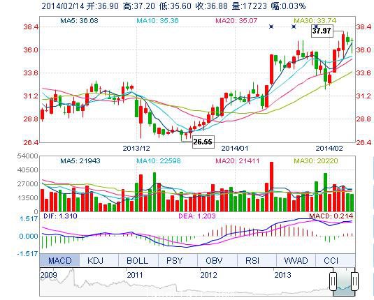 | 今 開: | 36.90 | 成交量: | 1.72萬手 | 振 幅: | 4.34% |