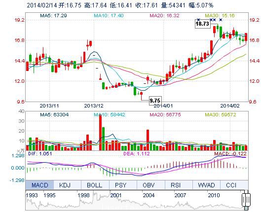 | 今 開: | 16.75 | 成交量: | 5.43萬手 | 振 幅: | 7.34% |