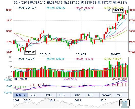 今開: 3876.15 最高: 3876.19 昨收: 3872.26 最低: 3827.65 成交量: 1872.41萬(wan) 手 振幅: 1.25% 成交額: 275.42億(yi) 元