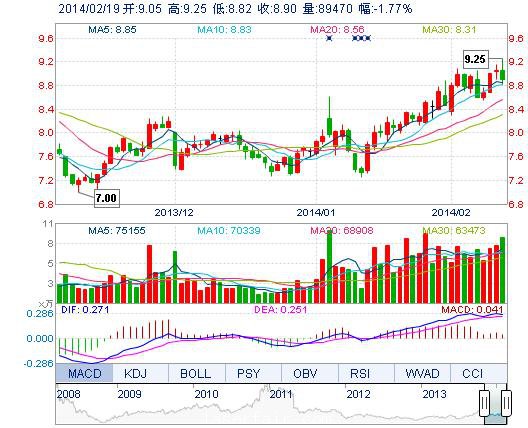 今開: 9.05 成交量: 8.95萬(wan) 手 振幅: 4.75% 最高: 9.25 成交額: 8061.24萬(wan) 元 換手率: 3.25% 最低: 8.82 總市值: 25.37億(yi) 市淨率: 4.07 昨收: 9.06 流通市值: ...