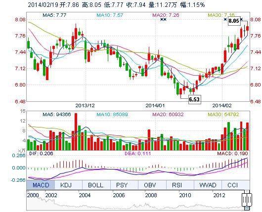 | 今 開: | 7.86 | 成交量: | 11.27萬手 | 振 幅: | 3.57% |