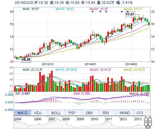 今開: 16.30 成交量: 25.62萬(wan) 手 振幅: 4.82% 最高: 16.39 成交額: 4.08億(yi) 元 換手率: 2.69% 最低: 15.60 總市值: 166.68億(yi) 市淨率: 4.73 昨收: 16.40 流通市值...
