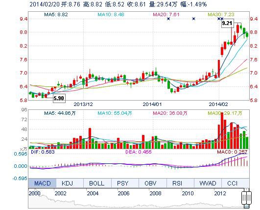 | 最 高: | 8.82 | 成交額: | 2.56億元 | 換手率: | 3.32% |