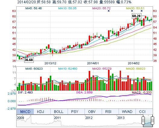 今開: 58.58 成交量: 5.56萬(wan) 手 振幅: 4.66% 最高: 59.70 成交額: 3.25億(yi) 元 換手率: 1.94% 最低: 57.02 總市值: 172.58億(yi) 市淨率: 11.37 昨收: 57.56 流通市值...