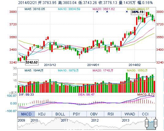 今開: 3763.95 最高: 3803.04 昨收: 3770.01 最低: 3743.26 成交量: 1434.61萬(wan) 手 振幅: 1.59% 成交額: 197.93億(yi) 元