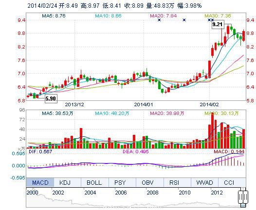 今開: 8.49 成交量: 48.83萬(wan) 手 振幅: 6.55% 最高: 8.97 成交額: 4.25億(yi) 元 換手率: 5.48% 最低: 8.41 總市值: 79.22億(yi) 市淨率: 2.94 昨收: 8.55 流通市值: 79...