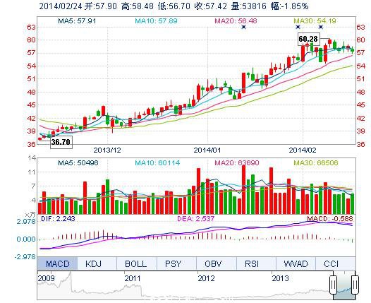 | 最 高: | 58.48 | 成交額: | 3.09億元 | 換手率: | 1.87% |